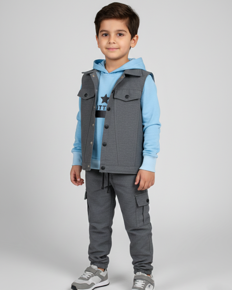هذه السترة الرائعة للأولاد مصنوعة من نسيج ناعم ومريح، مع تصميم بلا أكمام وجيوب عملية. الأسلوب العملي مثالي للإستخدام اليومي، مع هودي أزرق يضفي لمسة من اللون. إنها مثالية للخروج في الصيف أو أيام الراحة، وتجمع هذه الزي بين الجودة والأناقة. اكتشف حصريات العلامة التجارية زاريف، التي تجمع بين الأناقة والراحة.